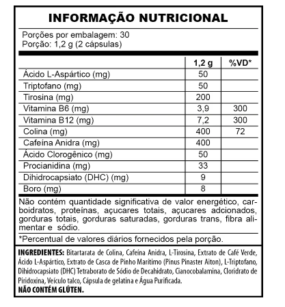 Bitartarata de Colina, Cafeína Anidra, L-Tirosina, Extrato de Café Verde, Ácido L-Aspártico, Extrato de Casca de Pinho Marítimo (Pinus Pinaster Aiton), L-Triptofano, Dihidrocapsiato (DHC) Tetraborato de Sódio de Decahidrato, Cianocobalamina, Cloridrato de Piridoxina, Veículo talco, Cápsula de gelatina de Água Purificada.
