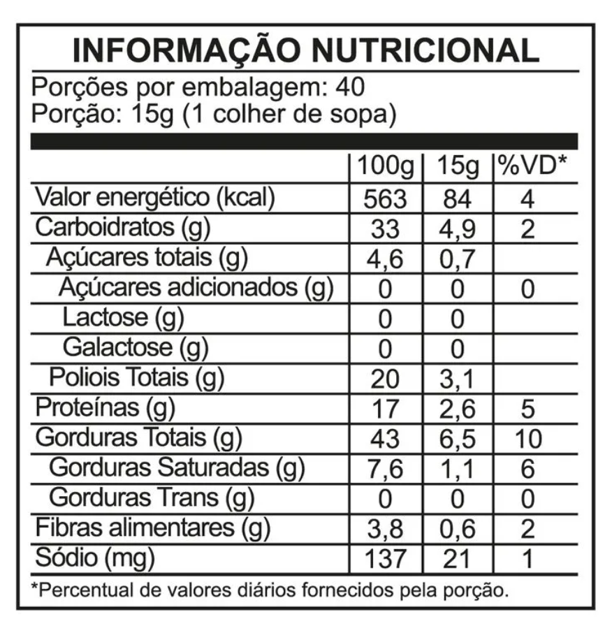 Ingredientes: Amendoim torrado, creme sabor leite (óleo vegetal, leite em pó, soro de leite em pó, gordura vegetal, proteína concentrada de soro de leite, lecitina de soja, edulcorante maltitol (INS965i), emulsificantes mono e diglicerídeos de ácidos graxos (INS471) e ésteres de poliglicerol de ácido ricinoléico (INS476) e aromatizantes), whey protein sabor baunilha, sal, enzima lactase, edulcorantes: xilitol, sucralose e acessulfame de potássio.
