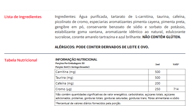 Ingredientes: Água purificada, tartarato de L-carnitina, taurina, cafeína, picolinato de cromo, especiarias aromatizantes pimenta cayena, pimenta preta, gengibre em pó, conservante benzoato de sódio e sorbato de potássio, estabilizante goma xantana, aromatizante idêntico ao natural, edulcorante sucralose, corante amarelo tartrazina e azul brilhante. NÃO CONTÉM GLÚTEN. ALÉRGICOS: PODE CONTER DERIVADOS DE LEITE E OVO.