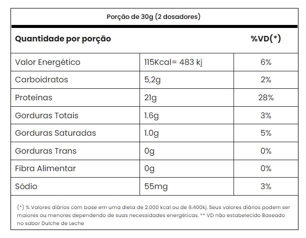 100% Proteína concentrada do soro do leite, aroma idêntico ao natural de baunilha, goma xantana, educorantes acessulfame de potássio e sucralose.