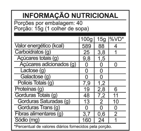 Ingredientes: Amendoim torrado, creme sabor beijinho (óleo vegetal, soro de leite, leite em pó desnatado, coco ralado, cacau em pó, emulsificantes lecitina de soja e ésteres de poliglicerol de ácido ricinoléico, edulcorante maltitol e aromatizantes), whey protein sabor chocolate branco, sal e edulcorantes: xilitol, sucralose e acessulfame de potássio.