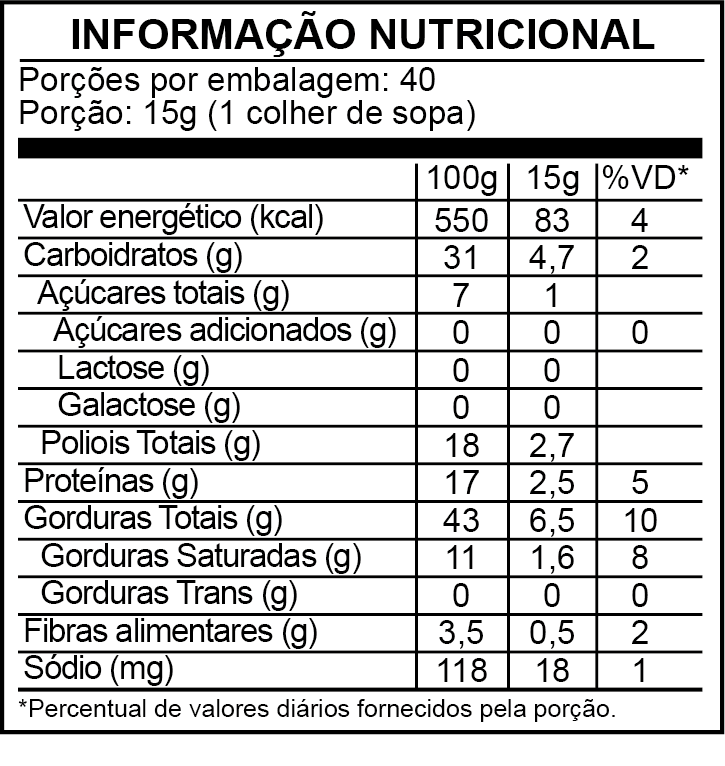ALÉRGICOS: CONTÉM AMENDOIM, DERIVADOS DE LEITE E SOJA. PODE CONTER AVELÃS, CASTANHA DO PARÁ, CASTANHA DE CAJU, AVEIA, OVOS, MACADÂMIAS, NOZES, PISTACHES E AMÊNDOA.