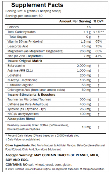Desenvolvido para quem busca atingir níveis insanos de CONCENTRAÇÃO, POTÊNCIA e PUMP VASCULAR, o Insane Original é feito pensado para atletas que estão buscando um treino insano. Com uma fórmula tradicional e única, o Insane Original já é conhecido por muitos, e foi criado para elevar seu desempenho em treino a um novo patamar.