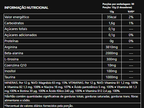 Cloridrato de L-arginina, beta-alanina, taurina, taurato de magnésio, maltodextrina, L-tirosina, inositol, coenzima Q10, nicotinamida, pantotenato de cálcio, cloridrato de piridoxina, biotina, mononitrato de tiamina, riboflavina, ácido fólico, cianocobalamina, acidulante ácido cítrico, antiumectante dióxido de silício e fosfato tricálcico, agente de massa glicerol, aromatizantes naturais beterraba em pó e melancia em pó, aromatizante idêntico ao natural, edulcorante sucralose e acessulfame de potássio, corante tartrazina e azul brilhante FCF.